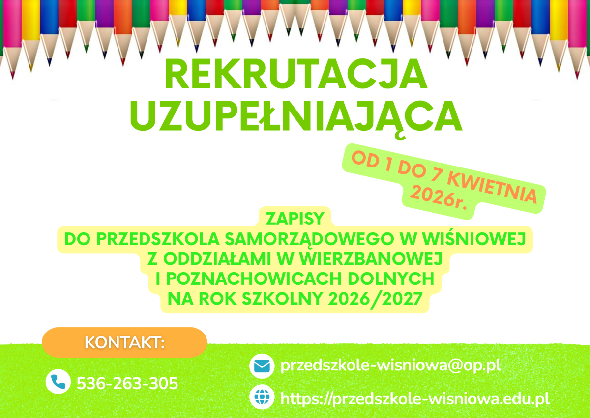 Dyrekcja Przedszkola Samorządowego w Wiśniowej z oddziałami w Wierzbanowej i Poznachowicach Dolnych informuje, iż rekrutacja uzupełniająca trwać będzie od 1 do 7 kwietnia 2026r. Wniosek o przyjęcie dziecka do przedszkola wraz z oświadczeniami dostępne są w budynkach poszczególnych placówek, a także do pobrania poniżej i w zakładce DOKUMENTY. Serdecznie zapraszamyCzytaj dalej.