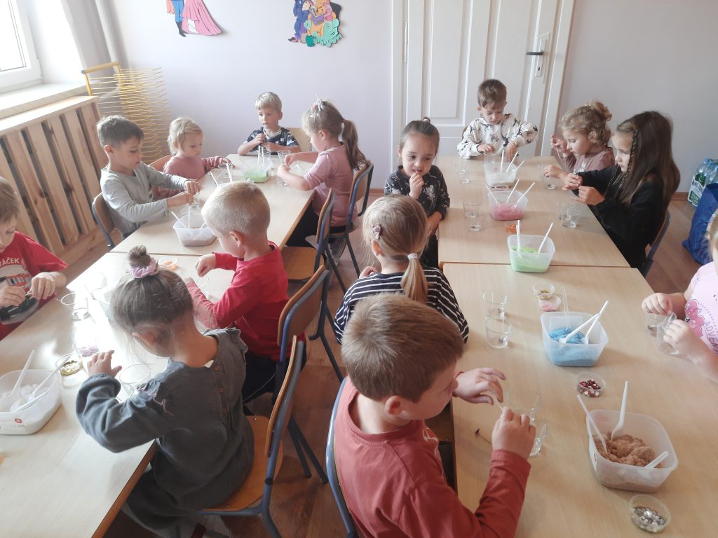 Dzisiaj w naszym przedszkolu odbyły się warsztaty, gdzie dzieci samodzielnie wykonywały świecę żelową. Pod okiem animatorów przedszkolaki wykonywały kompozycje z barwnego proszku. Ozdabiały świecę muszelkami, kamieniami oraz innymi błyskotkami. Warsztaty miały na celu pobudzić wyobraźnię, inspirować do kreatywnego myślenia oraz kształtować zmysł estetyczny. Każda świeca została pięknie zapakowana i gotowa aby uczynić z niej prezent dla kogoś wyjątkowego i bliskiego. Warsztaty sprawiły dzieciom wiele radości, a ich dzieła cieszą oczy najbliższych.
