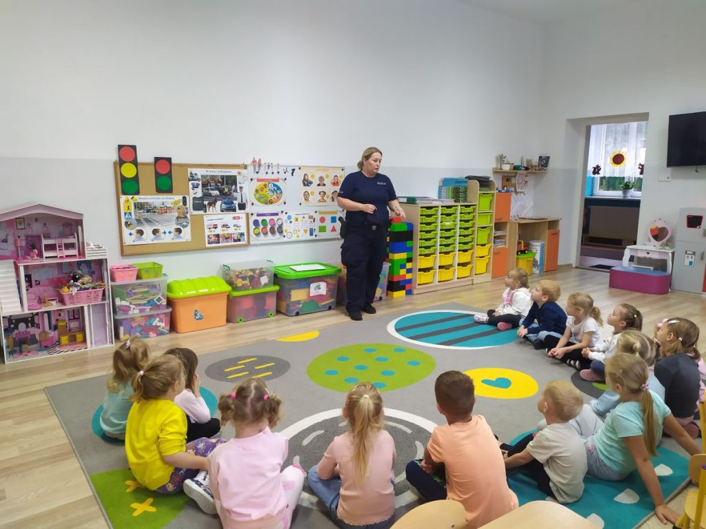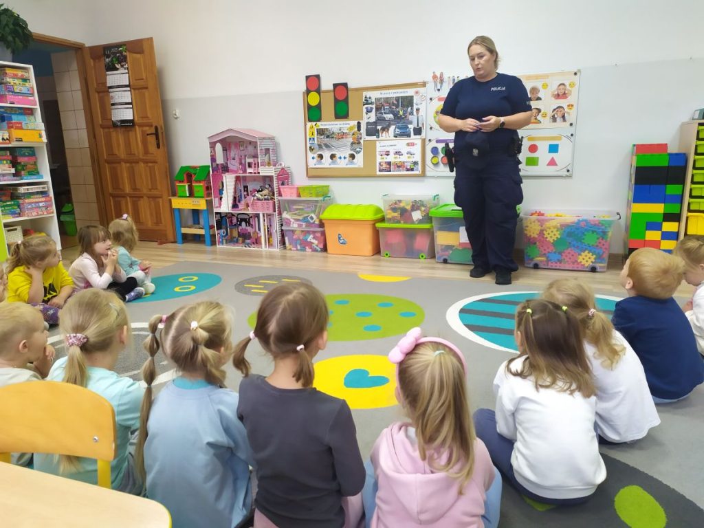 Wraz z nadejściem nowego roku szkolnego, w naszym przedszkolu odbyło się spotkanie profilaktyczne na temat bezpieczeństwa. 16 września odwiedziła nas pani policjantka – asp. Agnieszka Buda-Zembol. Dzieci poznały specyfikę pracy policjanta oraz podstawowe zasady bezpiecznego uczestnictwa w ruchu drogowym.
