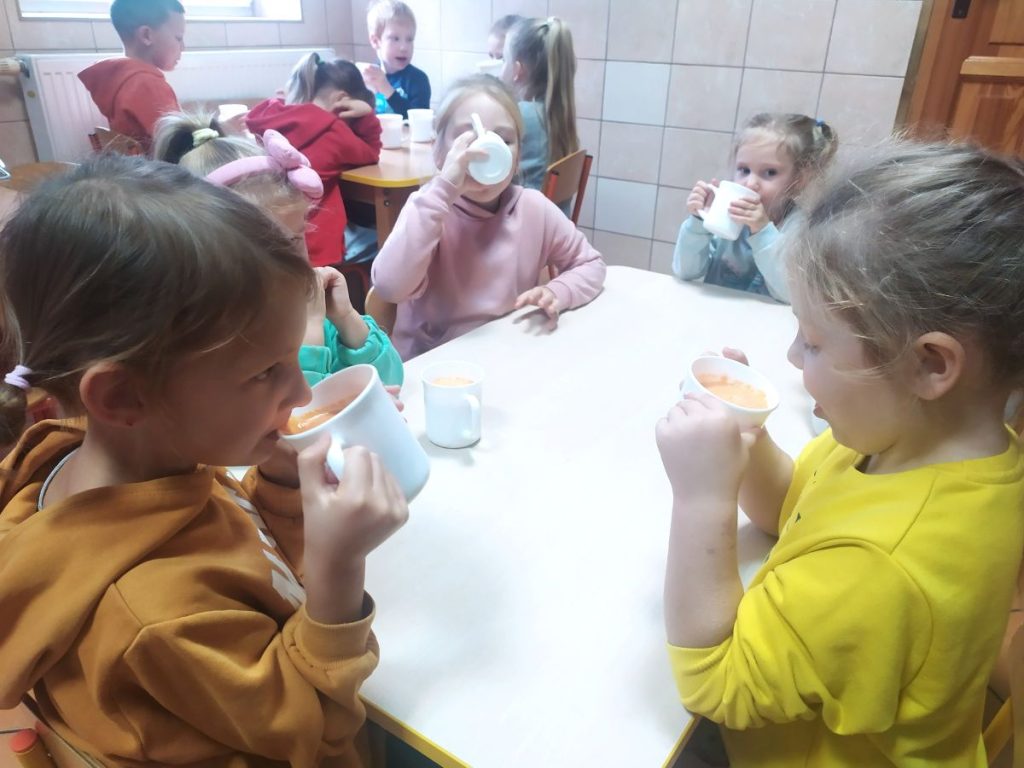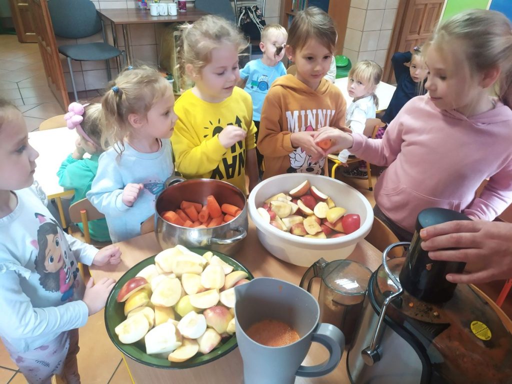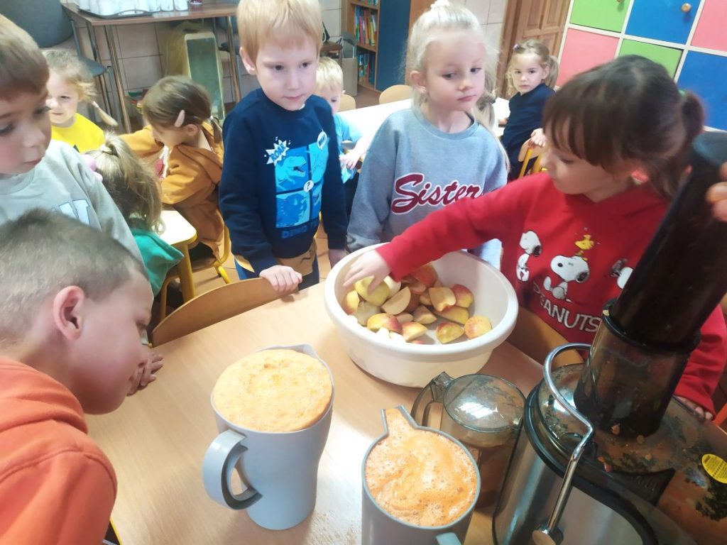 Wszyscy dobrze wiemy, że soki to doskonałe źródło witamin i cennych składników. Dlatego też w ramach podsumowania warzywno-owocowego tygodnia przygotowaliśmy wspólnie pyszny sok jabłkowo-marchewkowy. Dzieci zostały zapoznane z działaniem sokowirówki i zasadami bezpieczeństwa. Następnie przystąpiliśmy do pracy, a na koniec degustowaliśmy pyszny sok. Taki własnoręcznie przygotowany sok był nie tylko atrakcją, ale i ogromną dawką witamin. Dziękujemy Rodzicom za dostarczone jabłka i marchewki 😉