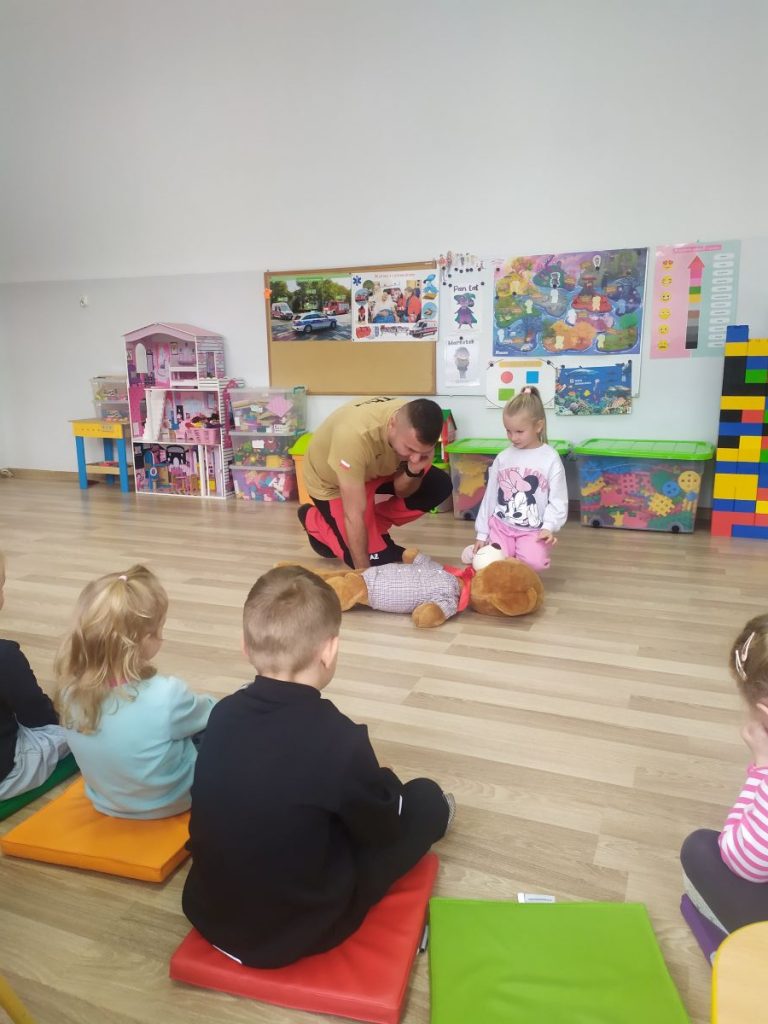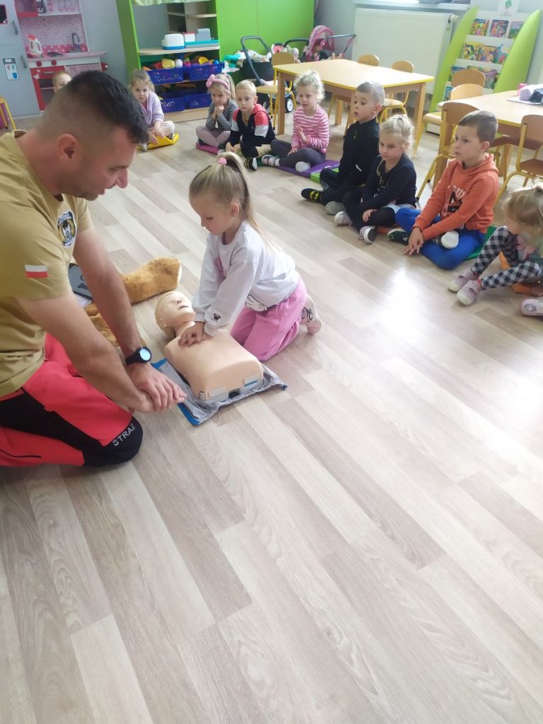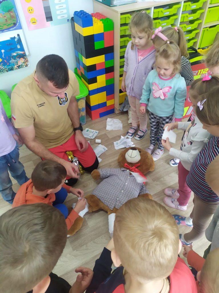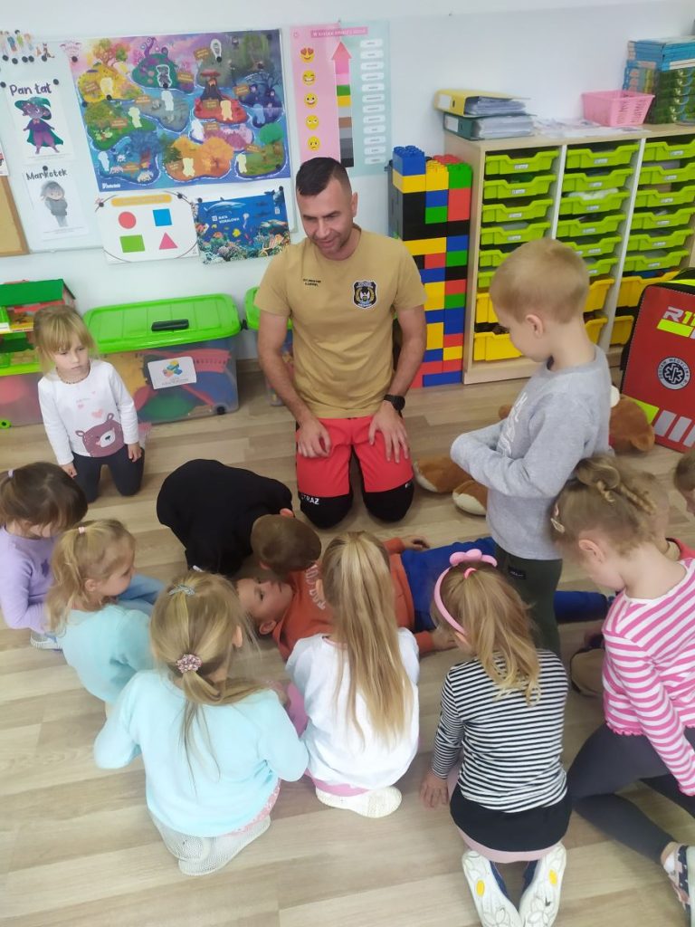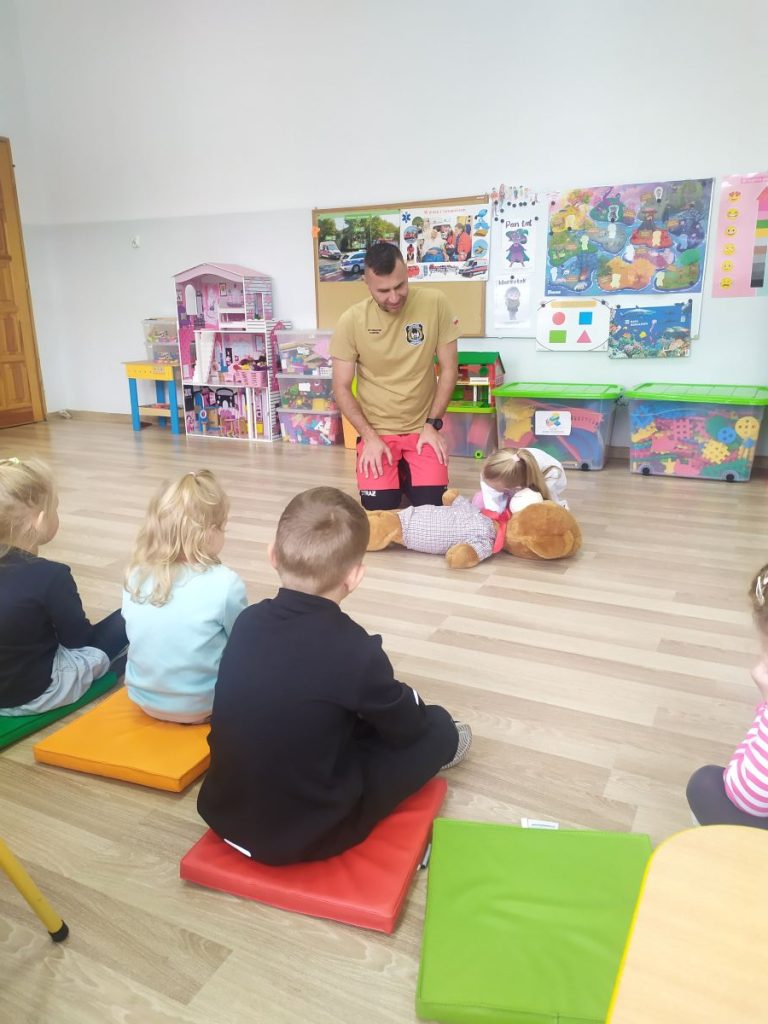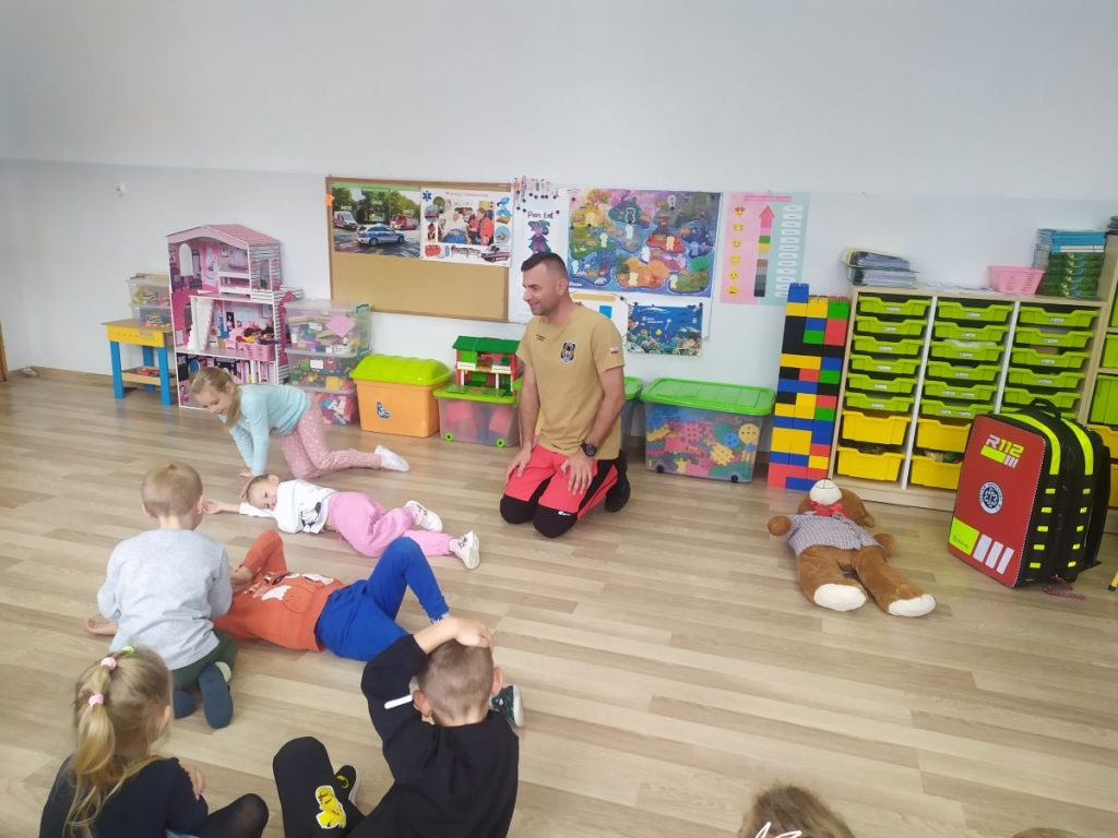 22 października gościliśmy w przedszkolu pana Sylwestra, strażaka-ratownika z Ochotniczej Straży Pożarnej w Wierzbanowej, który przeprowadził zajęcia warsztatowe dla dzieci z zakresu udzielania pierwszej pomocy przedmedycznej. Warsztaty obejmowały utrwalenie numeru alarmowego, zasad bezpiecznego zachowania w sytuacjach zagrożenia oraz wzywania pomocy. Ponadto dzieci utrwaliły podstawowe czynności ratownicze, takie jak opatrywanie ran, sprawdzanie przytomności, pozycja boczna bezpieczna oraz sposób ucisku klatki piersiowej. Pan Sylwester przeprowadził zajęcia w bardzo przystępny dla dzieci sposób, z użyciem fantoma-misia, a także fantomów szkoleniowych z aplikacją na urządzenia mobilne pozwalającą na monitorowanie tempa i głębokości ucisków oraz innych aspektów RKO. Każdy miał możliwość praktycznego działania, które sprawia, że łatwiej przyswajamy wiedzę i umiejętności.