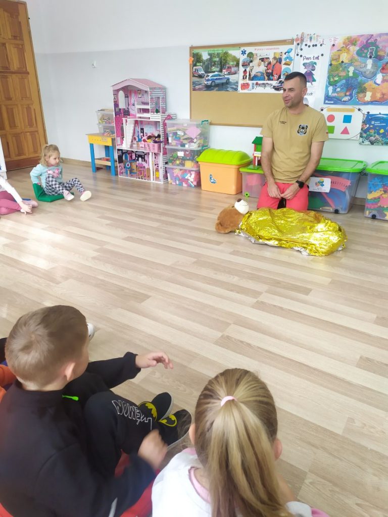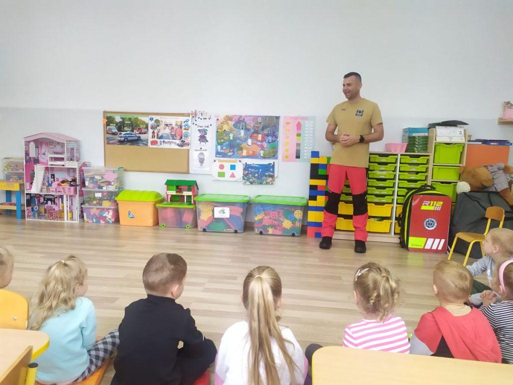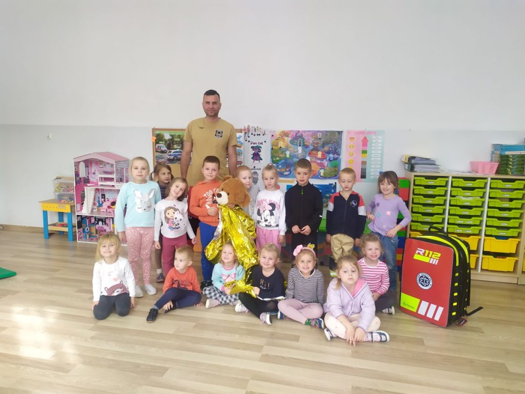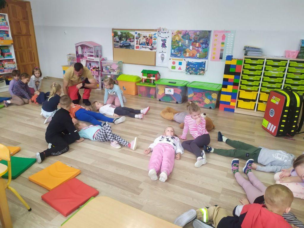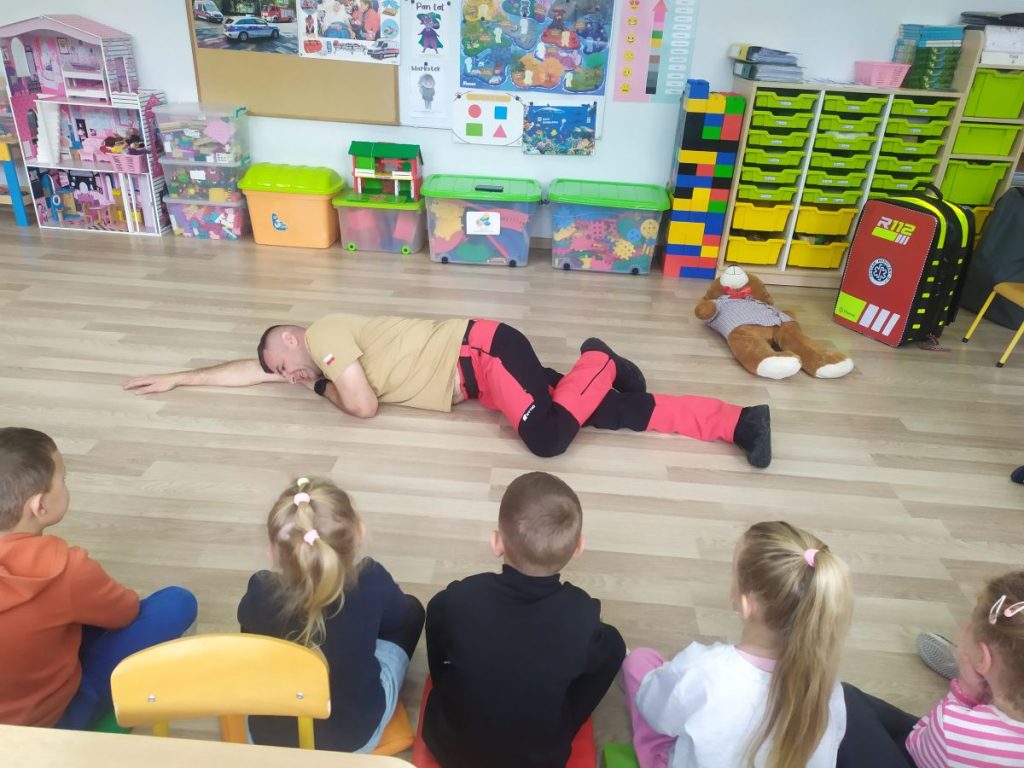 22 października gościliśmy w przedszkolu pana Sylwestra, strażaka-ratownika z Ochotniczej Straży Pożarnej w Wierzbanowej, który przeprowadził zajęcia warsztatowe dla dzieci z zakresu udzielania pierwszej pomocy przedmedycznej. Warsztaty obejmowały utrwalenie numeru alarmowego, zasad bezpiecznego zachowania w sytuacjach zagrożenia oraz wzywania pomocy. Ponadto dzieci utrwaliły podstawowe czynności ratownicze, takie jak opatrywanie ran, sprawdzanie przytomności, pozycja boczna bezpieczna oraz sposób ucisku klatki piersiowej. Pan Sylwester przeprowadził zajęcia w bardzo przystępny dla dzieci sposób, z użyciem fantoma-misia, a także fantomów szkoleniowych z aplikacją na urządzenia mobilne pozwalającą na monitorowanie tempa i głębokości ucisków oraz innych aspektów RKO. Każdy miał możliwość praktycznego działania, które sprawia, że łatwiej przyswajamy wiedzę i umiejętności.