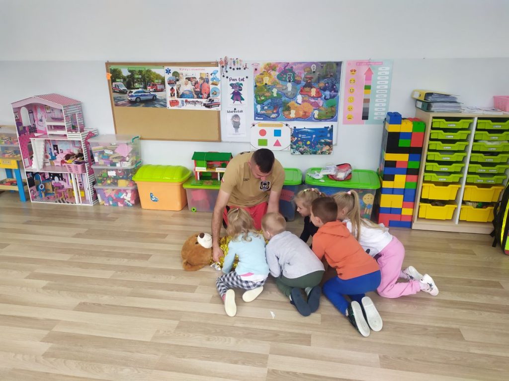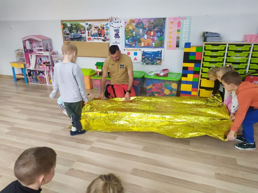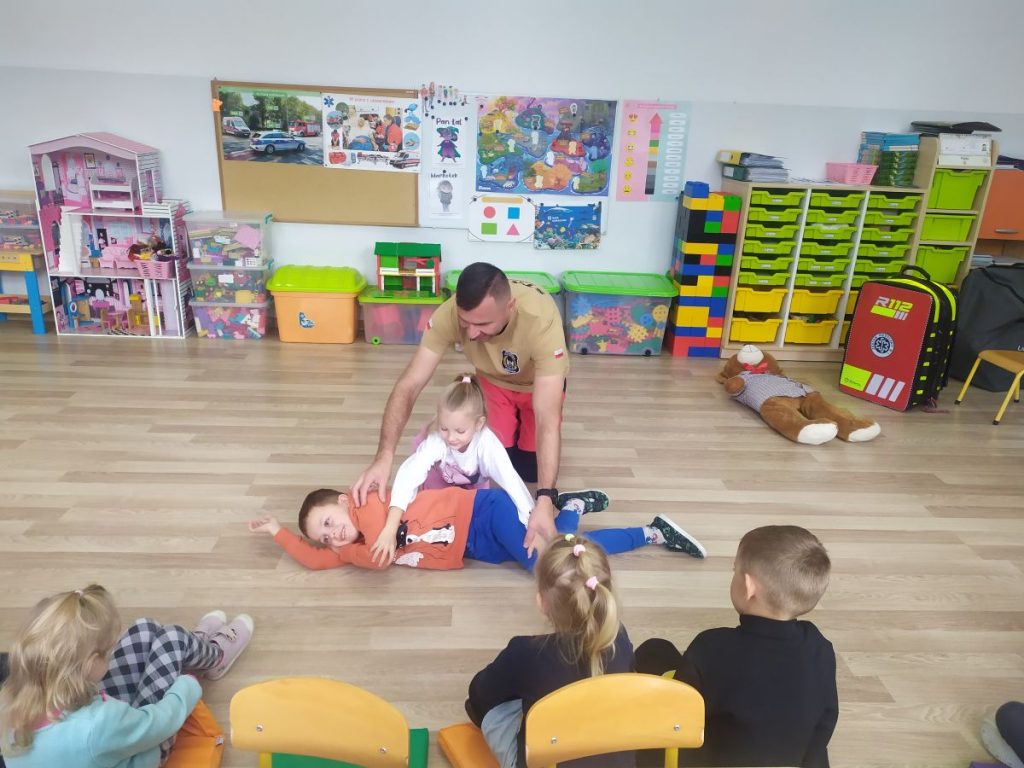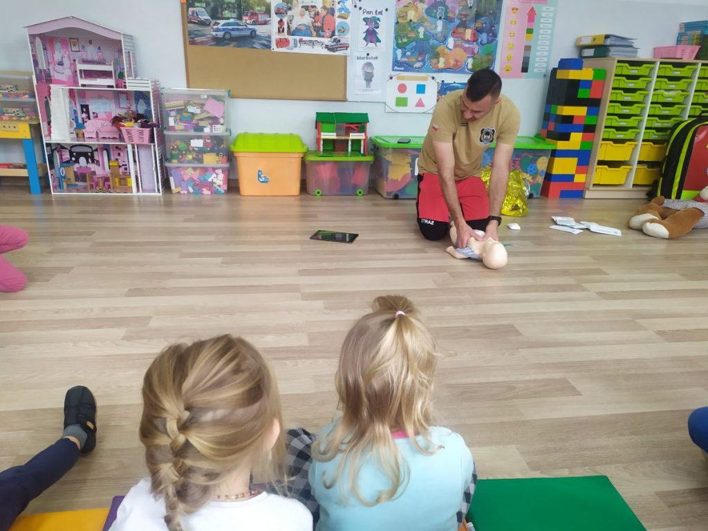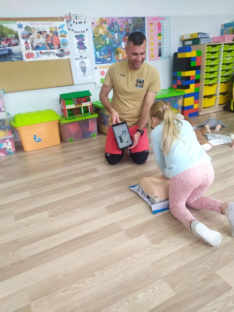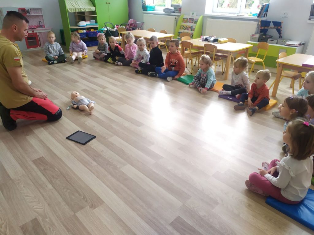 22 października gościliśmy w przedszkolu pana Sylwestra, strażaka-ratownika z Ochotniczej Straży Pożarnej w Wierzbanowej, który przeprowadził zajęcia warsztatowe dla dzieci z zakresu udzielania pierwszej pomocy przedmedycznej. Warsztaty obejmowały utrwalenie numeru alarmowego, zasad bezpiecznego zachowania w sytuacjach zagrożenia oraz wzywania pomocy. Ponadto dzieci utrwaliły podstawowe czynności ratownicze, takie jak opatrywanie ran, sprawdzanie przytomności, pozycja boczna bezpieczna oraz sposób ucisku klatki piersiowej. Pan Sylwester przeprowadził zajęcia w bardzo przystępny dla dzieci sposób, z użyciem fantoma-misia, a także fantomów szkoleniowych z aplikacją na urządzenia mobilne pozwalającą na monitorowanie tempa i głębokości ucisków oraz innych aspektów RKO. Każdy miał możliwość praktycznego działania, które sprawia, że łatwiej przyswajamy wiedzę i umiejętności.