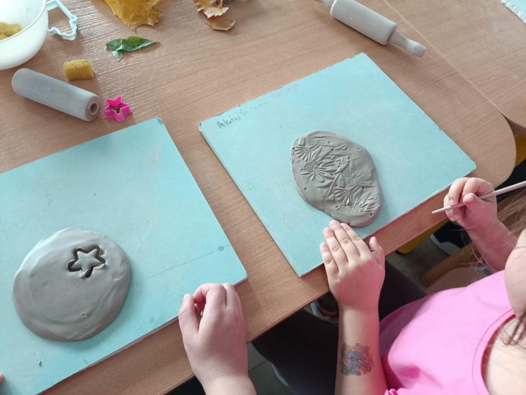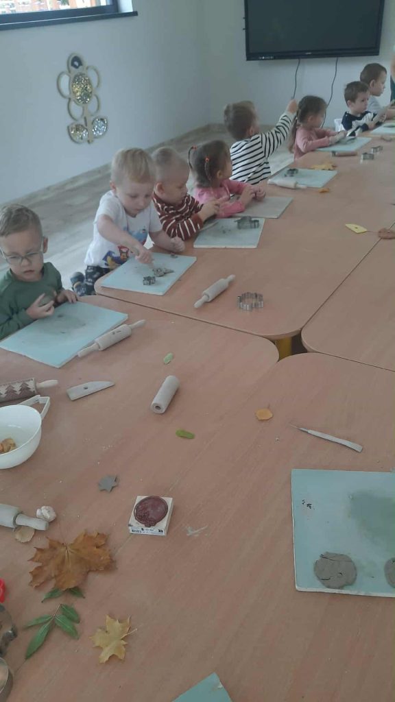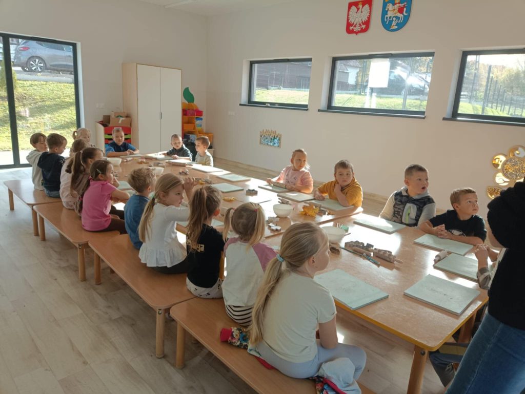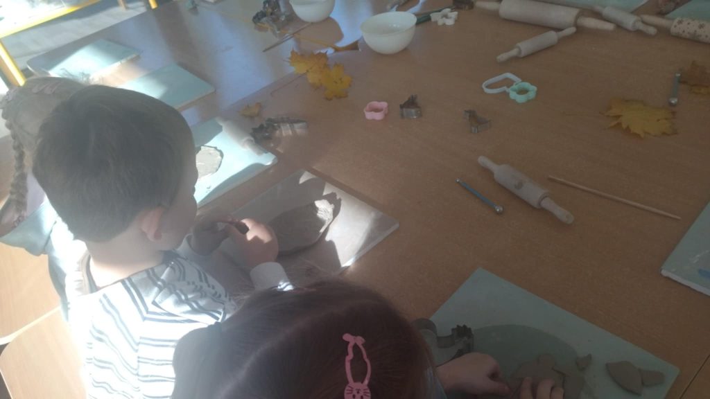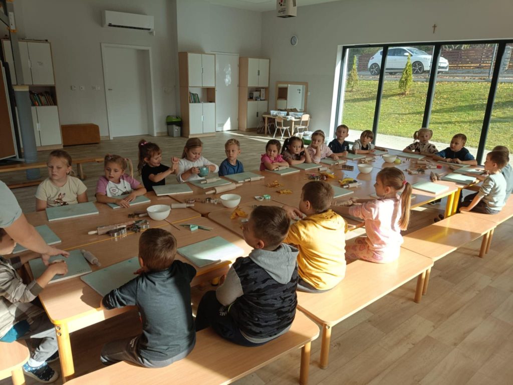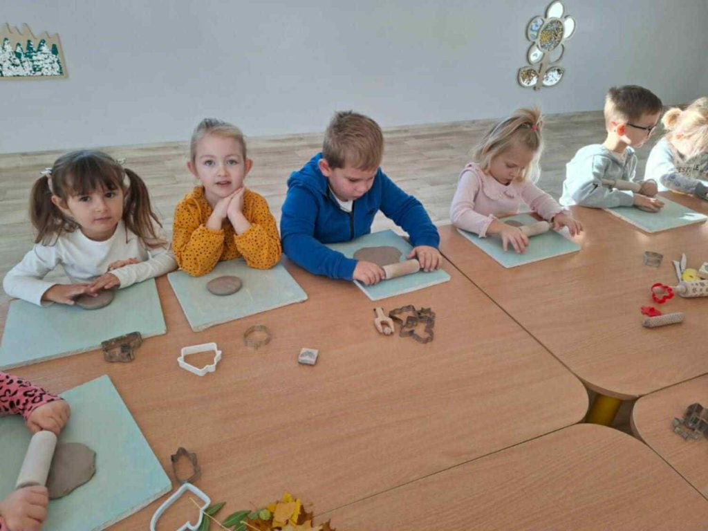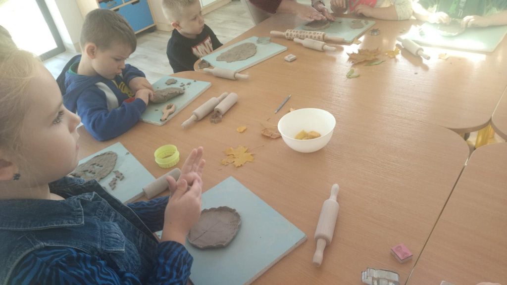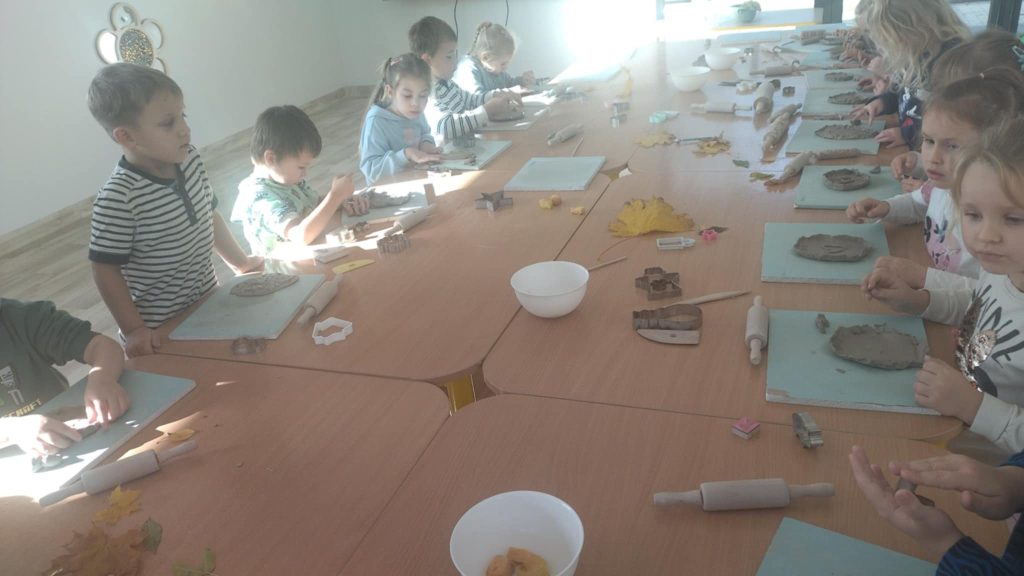z firmy Eve-Art. Dzieci instruowane przez panią Ewę ugniatały i wałkowały glinę, a następnie formowały kształty i ozdabiały rozmaitymi wzorami. Zajęcia sprawiły dzieciom dużo radości. Były świetną okazją do skupienia uwagi, uruchomienia wyobraźni, a także zabawą rozwijającą sprawność dłoni.