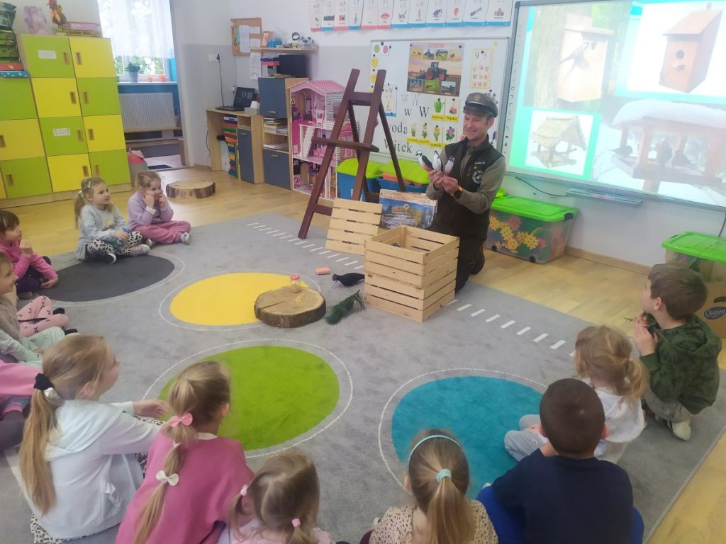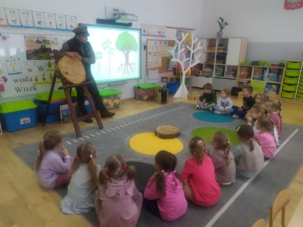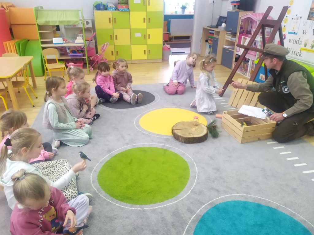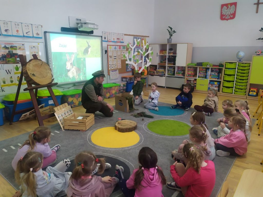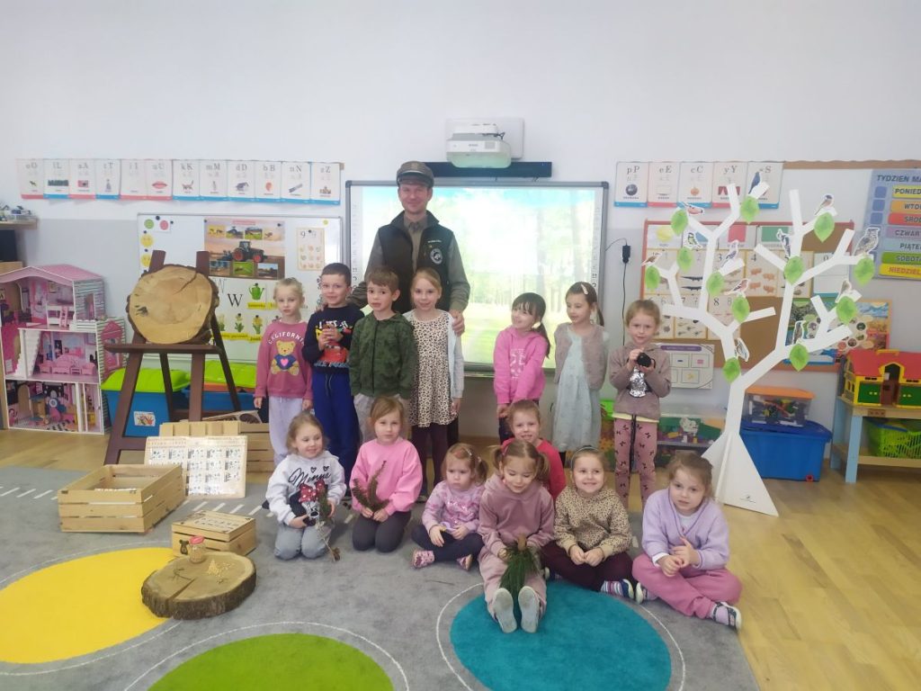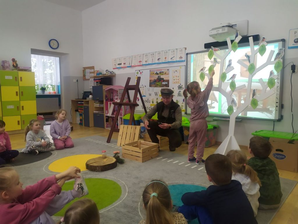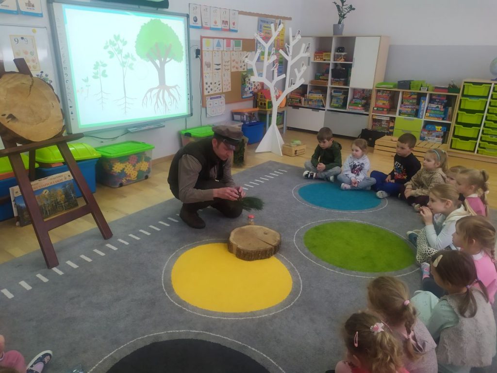 27 marca odwiedził nasze przedszkole Pan Tomasz Bartko- leśniczy z Nadleśnictwa w Myślenicach. Pan Tomasz przybliżył dzieciom specyfikę swojej pracy oraz przeprowadził niezwykle interesujące zajęcia przyrodnicze, podczas których dzieci wzbogaciły swoją wiedzę na temat świata natury. Dzieci dowiedziały się jak wygląda proces wzrostu drzewa- od maleńkiego nasionka aż po potężne drzewo. Pan leśniczy opowiadał o ptakach i ssakach zamieszkujących polskie lasy, przybliżając dzieciom ich zwyczaje. Podkreślił, że człowiek jest gościem w lesie i musi szanować zwyczaje jego mieszkańców. Spotkanie było wyjątkowe również dzięki bogatej kolekcji naturalnych okazów, które nasz gość przyniósł ze sobą. Dzieci mogły zobaczyć z bliska elementy lasu, dotknąć, a przy tym lepiej poznać. Wszyscy z dużym zainteresowaniem słuchali i dzielili się swoimi spostrzeżeniami i doświadczeniami.