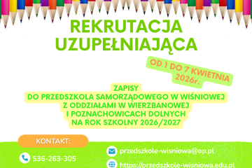 Dyrekcja Przedszkola Samorządowego w Wiśniowej z oddziałami w Wierzbanowej i Poznachowicach Dolnych informuje, iż rekrutacja uzupełniająca trwać będzie od 1 do 7 kwietnia 2026r. Wniosek o przyjęcie dziecka do przedszkola wraz z oświadczeniami dostępne są